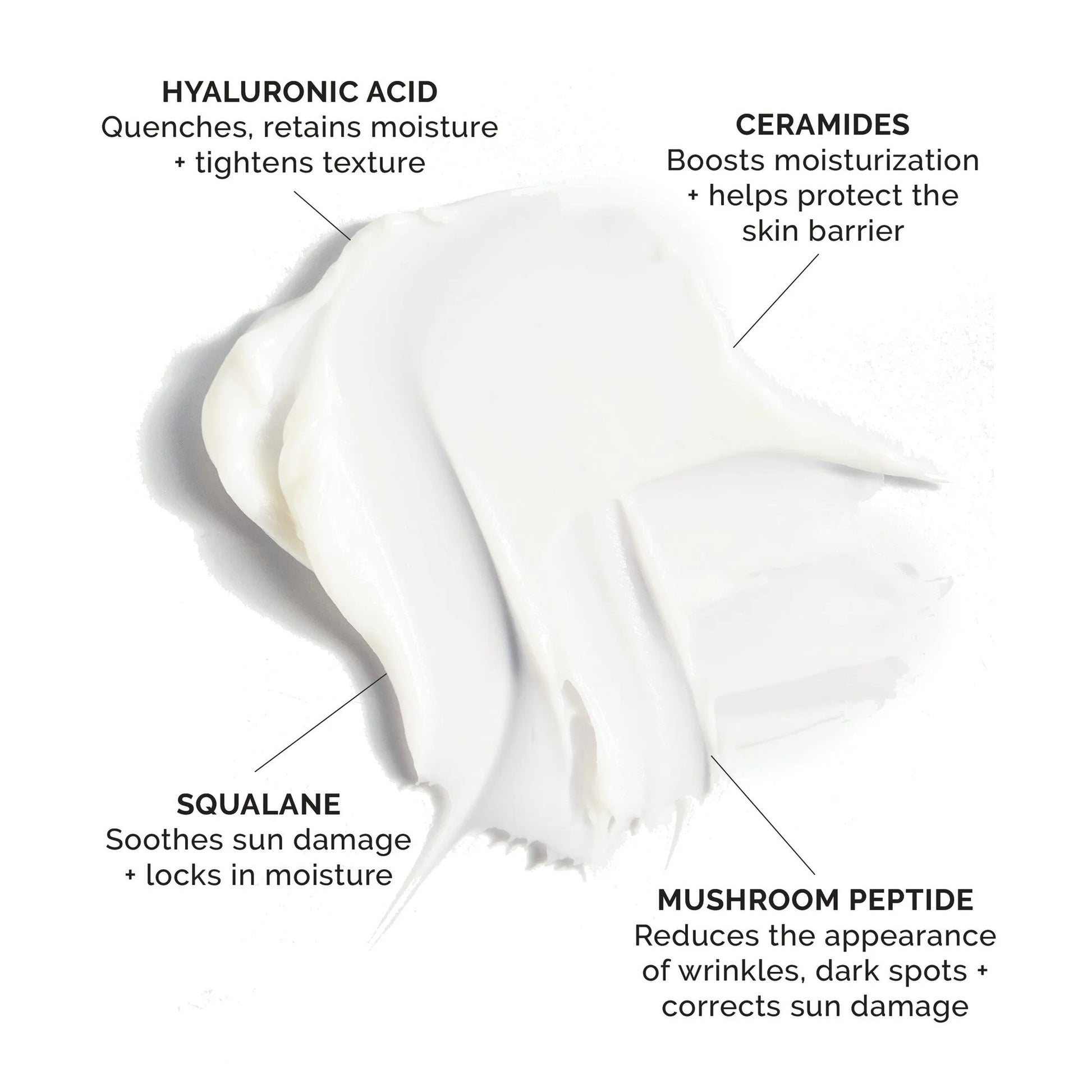 DETAILS: A powerhouse “super moisturizer” packed with Hyaluronic Acid, Mushroom Peptide + Squalane to reduce wrinkles, decrease dark spots, tighten, brighten, smooth, and improve skin with each use. Featuring the MDSS proprietary antioxidant complex ProVentionR®, that works to Protect, PreVent + Restore effects from UV rays and environmental stressors. Synthetic Fragrance Free.